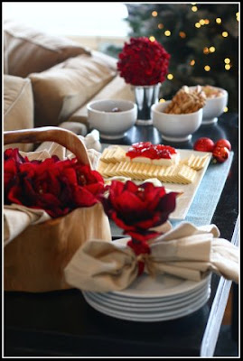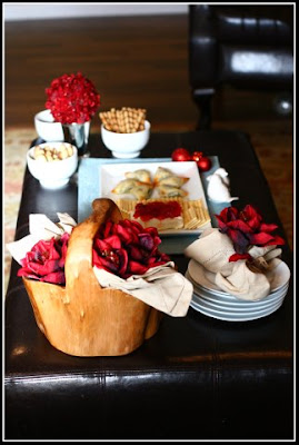 I then used my Pier 1 White Porcelain Rectangle Servers {medium} to be my blank canvas to hold my yummy appetizers. A few ornaments for color and serving bowls to allow more snacking variety...done.